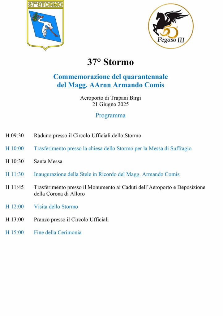 Per volontà della famiglia sabato 21 Giugno alle 10.30 si terrà presso l’aeroporto di Trapani Birgi una funzione religiosa in ricordo del collega scomparso, seguirà la deposizione di una corona al cippo che ricorda il tragico evento e quindi, alle 13.00 un pranzo al circolo ufficiali con gli intervenuti. Segue il Programma dell’evento: